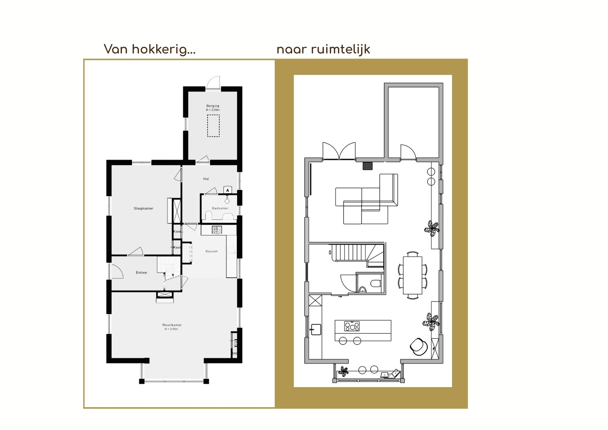 Ons nieuwe huis is heel hokkerig, terwijl wij graag een zo open mogelijke ruimte wilden. Madelon heeft voor ons verschillende indelingsopties gemaakt, zowel voor de begane grond als de bovenverdieping. Daar zaten een aantal verrassende indelingen bij, die ons tot waardevolle nieuwe inzichten brachten. Wij gaan onze verbouwing met vertrouwen tegemoet!